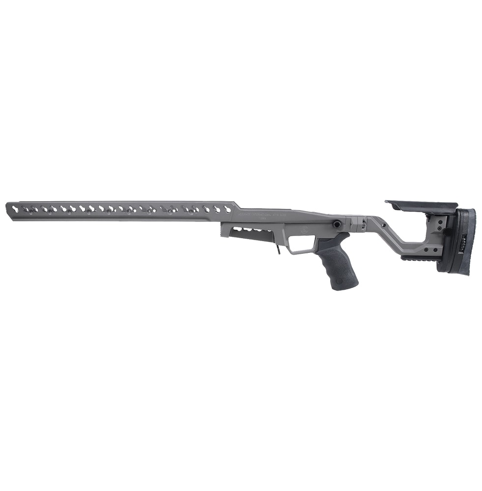 The Accuracy International AT-X Chassis is designed specifically for professional competition shooters, embodying the renowned quality and precision associated with Accuracy International. Adapted from the acclaimed AT-X Rifle, the Accuracy International AT-X Chassis features a fixed stock that can be finely adjusted for the user's preferred length of pull, cheek height, and recoil-pad height/cant through the use of corresponding knobs. The fore-end of the AT-X Chassis is equipped with KeySlot mounting points at the 3, 6, and 9 o'clock positions, running the entire length to accommodate various accessories such as weights, fore-end bridges, sling swivels, bipod mounts, and rails. An integrated ARCA rail on the fore-end bottom allows for easy installation and adjustment of a compatible bipod or tripod. The magazine well is overcut to facilitate quick magazine changes, and an integrated barricade stop enhances stability during unconventional shooting positions. the AT-X Chassis is tailored to meet the precise needs of professional competition shooters.