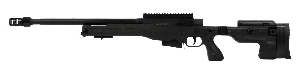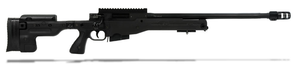 This black Accuracy International AT .308 Winchester rifle has a folding stock, 20" threaded barrel, adjustable cheekpiece, sling points, pistol grip, 3 position safety, two-stage trigger, flat-bottomed action, 20mm diameter close fitting bolt with six locking lugs, one-piece extractor, corrosion resistant magazine, and muzzle brake.