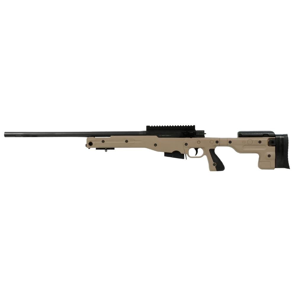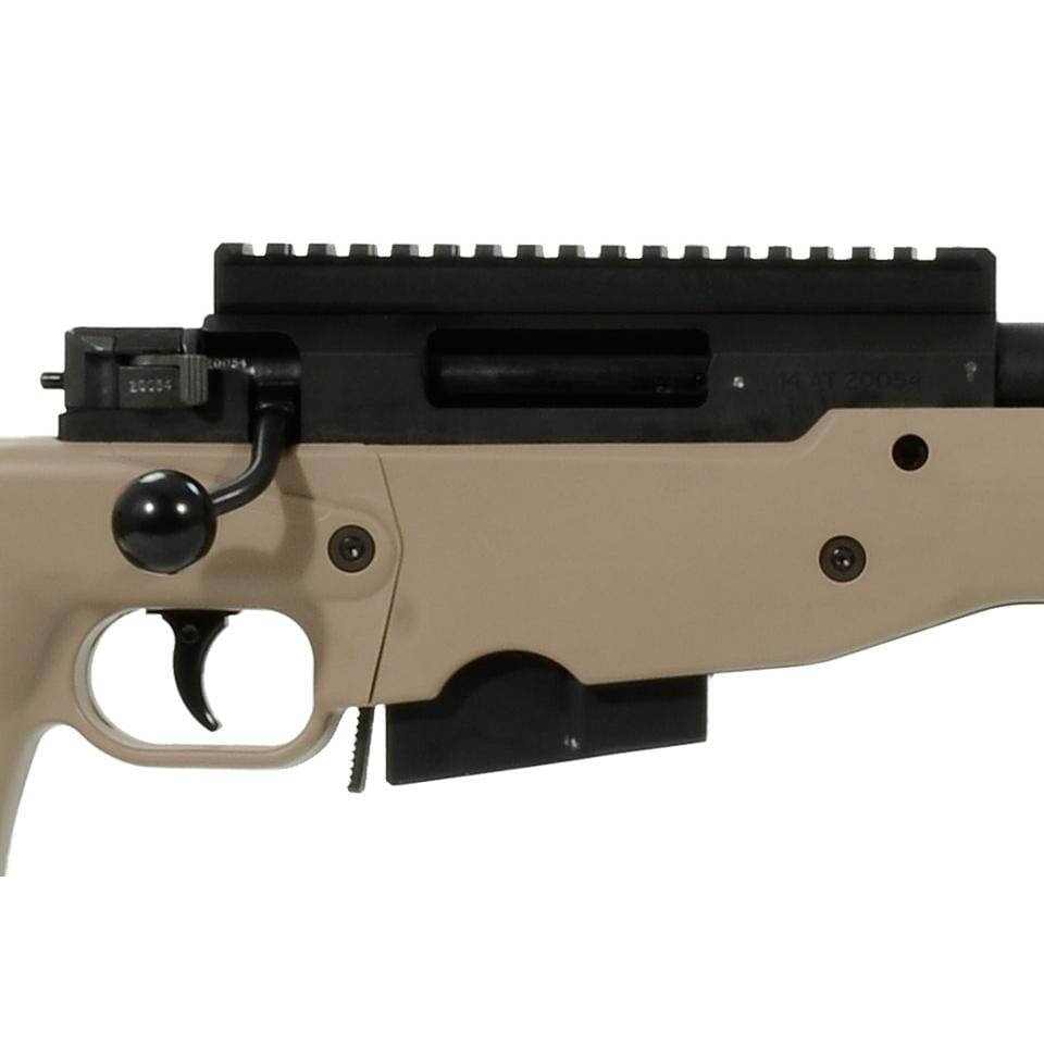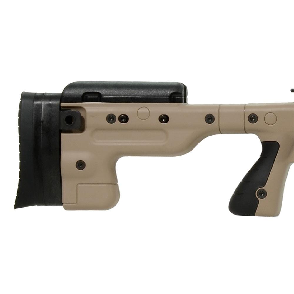 This pale brown Accuracy International AT .308 Winchester rifle has a fixed stock, small diameter firing pin, 24" non-threaded barrel, adjustable cheekpiece, sling points, pistol grip, 3 position safety, two-stage trigger, flat-bottomed action, 20mm diameter close fitting bolt with six locking lugs, one-piece extractor, and corrosion resistant magazine.