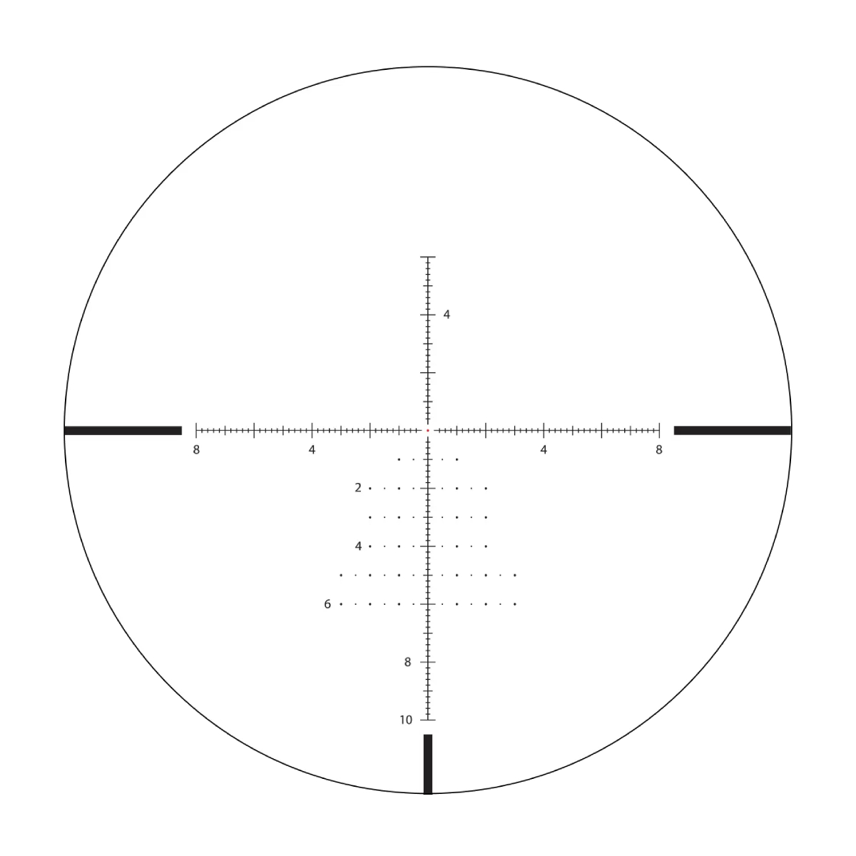 The APRS7 SFP IR MIL reticle is specifically crafted for precision shooting at both long and mid-range distances. It boasts an illuminated floating center dot and 0.2 mil hash mark increments extending in all four directions. This design allows for rapid target acquisition, easy establishment of holdover positions, and tracking of moving targets. The illuminated 0.07 mil center dot enhances visibility in low-light conditions and effectively guides the shooter's aim toward the target, even when engaging small targets at extended ranges, ensuring minimal view obstruction.