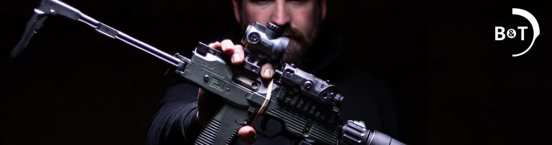 The B&T TP9-N is the semiautomatic version of the MP-9-N. It features a smaller frame when compared to other weapons in its class. The TP9 sports a top mounted picatinny rail with plenty of rail space for mounting a wide range of optics as well as two side mounted rails for the installation of lights and lasers. It also has low profile back up iron sights in the form of a fixed front post sight and a windage adjustable rear peep sight. The safety switch is ambidextrous and easy to engage/disengage. The charging handle is reminiscent of the AR-15, and in the event the handle gets stuck, there is a hold cut into the slide: insert a 9mm round into the hole and use it to safely cock/clear the weapon.