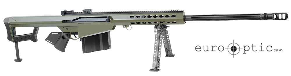 The Barrett M82A1’s semi-automatic action relies on a rotating recoil operated bolt and is available with a 20” CQB barrel or 29” long range barrel. M82A1 rifles chambered in .416 Barrett exclusively use a 29” barrel. The receiver is made from steel to ensure unparalleled durability and also to add significant weight to mitigate the powerful recoil of the .50 BMG cartridge. Barrett M82A1 rifles ship with a lightweight quick-detach bipod that allows you to fire the rifle from a supported or prone position. .50 BMG Barrett M82A1s use an arrowhead shaped 2-port muzzle break for recoil mitigation and the .416 barrel M82A1s use a cylindrical 3-port muzzle break. M82A1 comes standard with a 23” Picatinny with a 27 MOA cant.