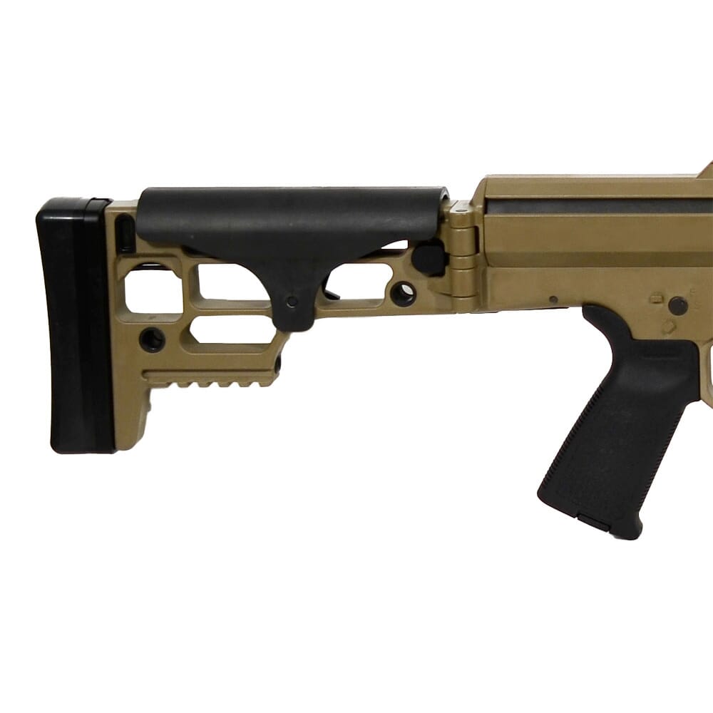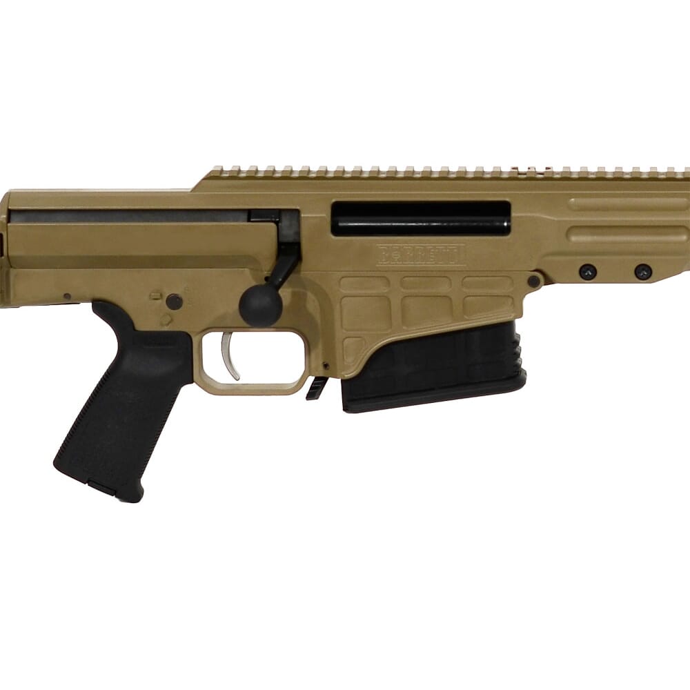 This modular Barrett MRAD .260 Remington Rifle System features a flat dark earth folding stock with adjustable cheekpiece, 24" fluted barrel, ambidextrous magazine release, single button length of pull adjustment, trigger module removable without tools, front-loading barrel design for caliber changes.