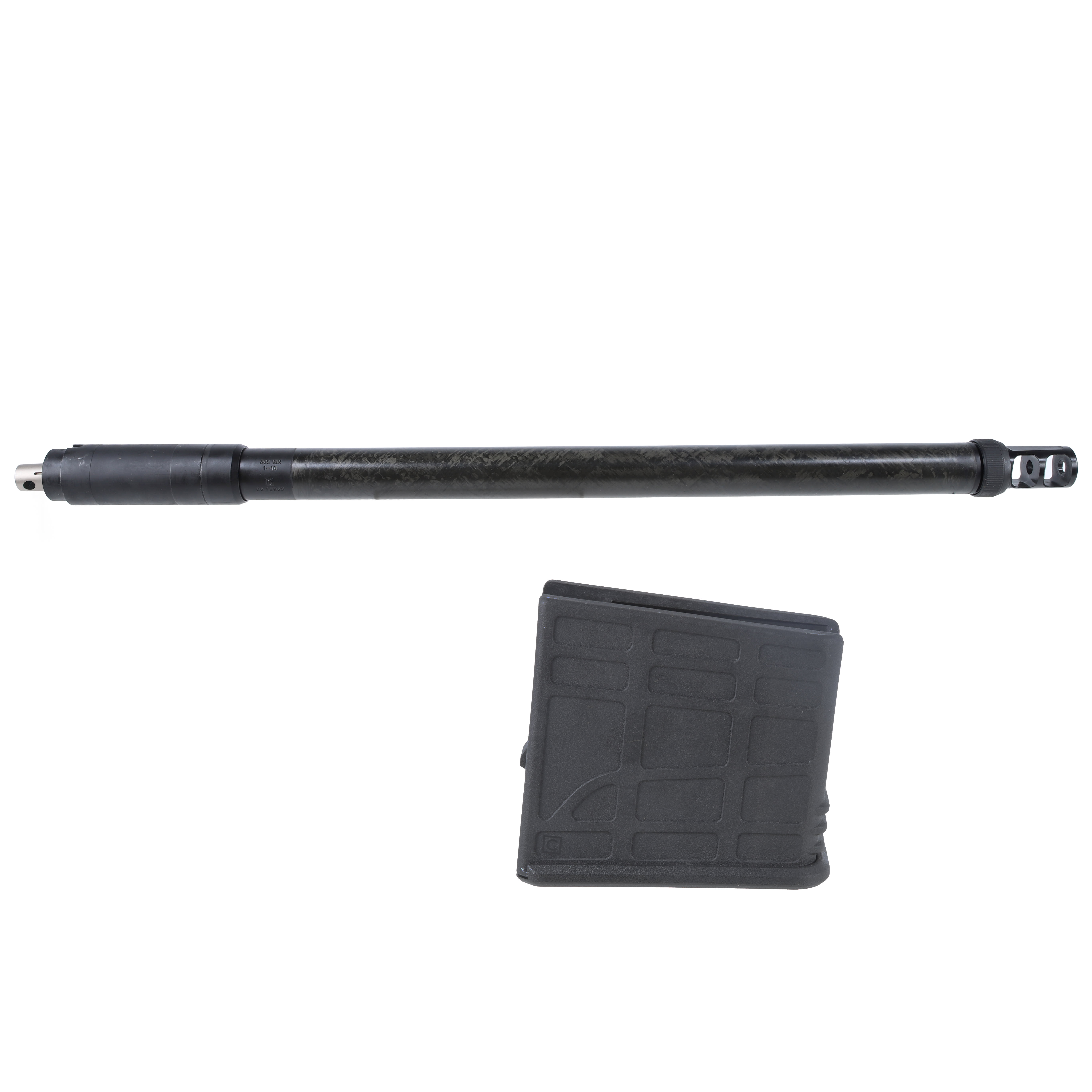The Barrett MRAD .308 Win 22” Carbon Fiber Conversion Kit is a precision upgrade designed for MRAD small-breech rifles. Featuring a match-grade stainless steel barrel wrapped in lightweight carbon fiber, it offers enhanced durability, improved heat dissipation, and reduced overall weight. With a 22-inch barrel length, standard 5/8x24 thread pitch, and a typical 1:10 twist rate, this kit delivers excellent accuracy and long-range performance. The package includes the barrel, bolt head, magazine, muzzle brake, and a protective storage bag, making it a complete solution for shooters seeking a lightweight, reliable, and high-performance barrel system.