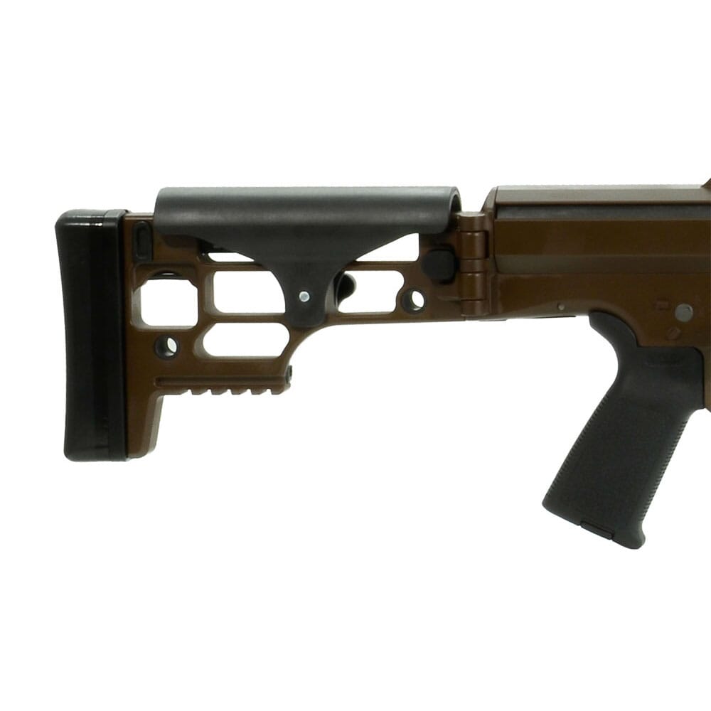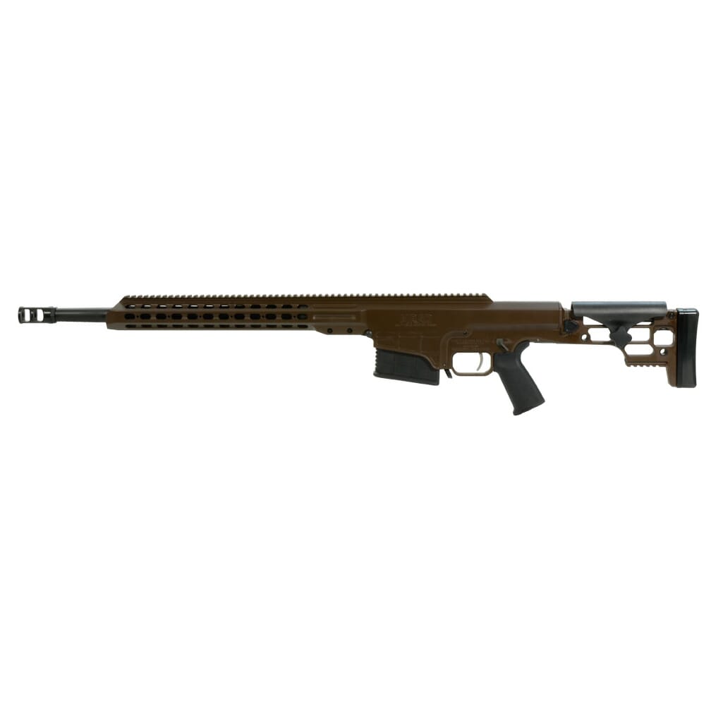 The Barrett MRAD rifle's stock is foldable for enhanced portability yet locks in as solid as a fixed stock rifle, creating a rigid platform for consistent firing. When folded, the stock latches around the bolt handle for added security during transport. Because the stock folds to the bolt handle side of the action, the rifle is the same width overall, folded or extended. Made of a temperature resistant polymer, the adjustable cheek piece also offers a consistent rifle to user contact point. The rifle's length of pull can be set to five different positions with the push of a single button. From its multi-positional quick-detach sling sockets to the Barrett Multi-Role Brown color of the rifle that blends into any environment-every detail of the Barrett MRAD has been carefully designed to create one thing: a high-performance rifle you can truly make your own.