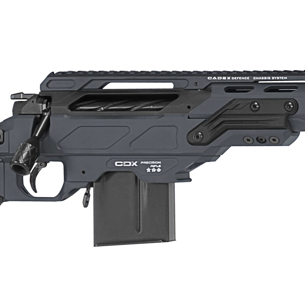 The CDX-Lite Rifle uses Cadex’s Lite Strike Chassis with features designed specifically for snipers. The Lite Strike Chassis is machined from 6061-T6 aluminum billets, anodized, and then finished with a non-reflective paint. The folding buttstock of the Lite Strike Chassis is completely tool free and adjustable for length of pull, cheek height, and recoil pad height. Additionally, the buttstock features a small Picatinny rail section for the mounting of a bipod or bag rider. The oversized trigger guard ensures that the shooter can confidently manipulate the trigger while wearing gloves. The forend of the rifle is outfitted with M-LOK attachment points and pre-installed picatinny rails at the 3, 6, and 9 o’clock positons for the mounting of bipod and other mission critical accessories.