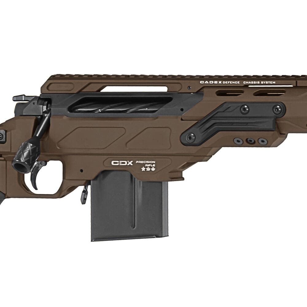 The Cadex CDX-Lite Rifle combines a wide array of mission critical features into one long range sniper rifle. Depending on the caliber, the CDX-Lite features one of Cadex’s the custom actions: the CDX-30 Guardian Action (short action calibers), the CDX-300 Freedom Action (.300 Win. Magnum), or the CDX-33 Patriot (.300 Norma Magnum, .338 Norma Magnum, or .338 Lapua Magnum). All three action types are CNC/wire EDM machined from 416 Stainless Steel and are cerakoted. The bolt utilizes 3 lugs, allows for a 60° bolt throw, and is fluted for weight reduction. Each CDX-Lite rifle is outfitted with a Bartlein straight taper match grade barrel that has been fluted for weight reduction and increased barrel cool down. Additionally the barrel of Cadex’s CDX-Lite is 5R Single Pointed rifled for unparalleled accuracy. The rifle features Cadex’s own DX2 Evo Two Stage trigger than can be easily converted to a one stage trigger based on the shooters preference.