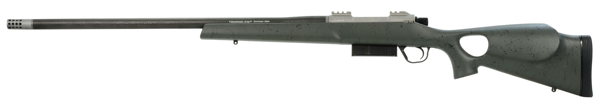 The ultimate hunting rifle. This Christensen Arms Summit 6.5x284 is a workhorse which features a 26" barrel, timney trigger, and green carbon fiber thumbhole stock with black webbing.