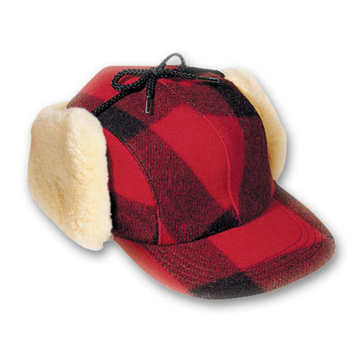 This small, red and black Filson Double Mackinaw Cap is durable and warm with natural sheepskin ear flaps, an insulated crown, 3" bill, inner polyester quilting, and black nylon lining. Dry clean only.
