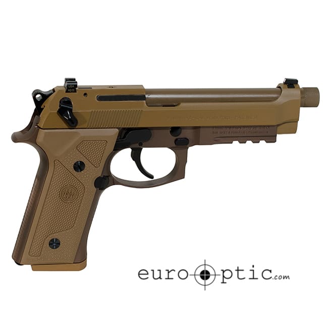 This Beretta M9A3 9mm pistol features a 5.2" extended threaded barrel with 1/2x28 threads, removeable night sights, universal safety decocking lever, slide stop lever, front and back strap checkering, wrap-around backstrap grip, beveled magazine well, thin grip panels, steel trigger, disassembly lever, oversized magazine catch, and a three slot mil std 1912 picatinny rail. Includes three 10 round magazines.