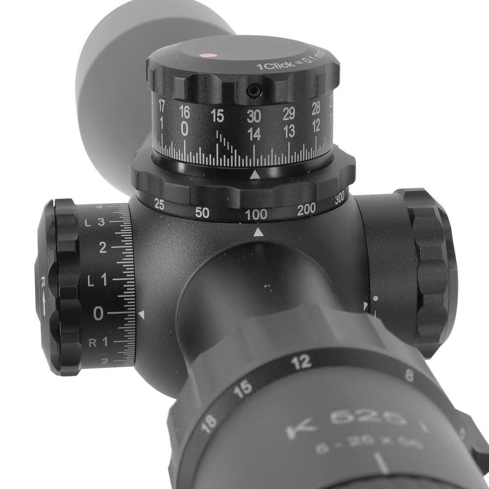 The K525i features an illuminated first focal plane reticle that has precise impact correction adjustment of .1 MRAD or .25 MOA. The K525i is available in four reticles designed for tactical and long range shooting: