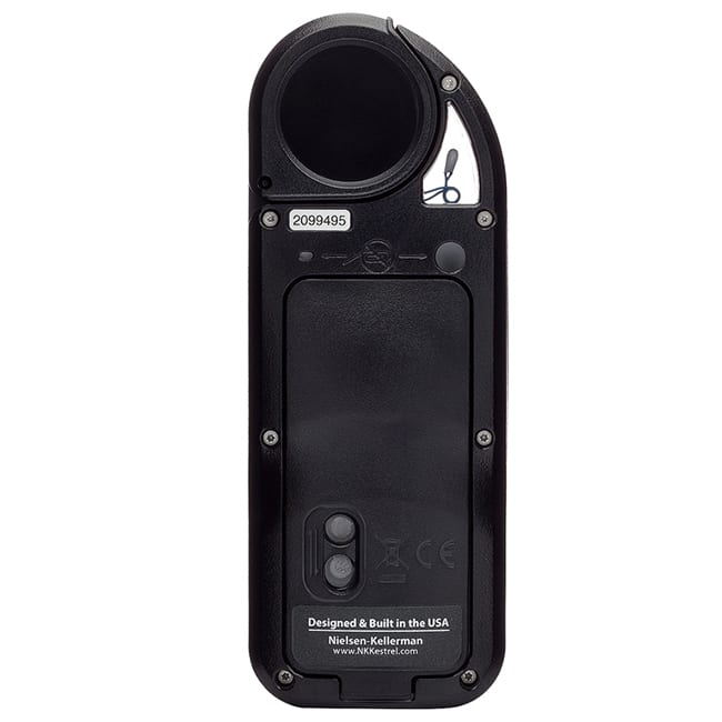 This black Kestrel 5000 Environmental Meter measures wind speed, air speed, temperature, humidity and pressure, tracks and logs over 10,000 sets of time-stamped data, and features a rugged, waterproof construction.