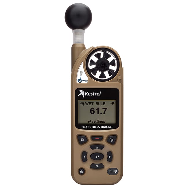 This desert tan Kestrel 5400 Heat Stress Tracker measures wet bulb globe temperature, thermal work limit, heat index temperature, humidity, and humidity. The natural wet bulb temperature is calculated from on-board digital sensors and does not require water.