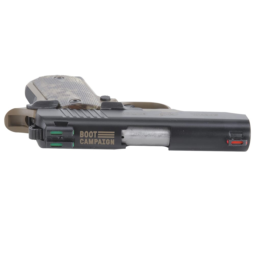 The Boot Campaign stands for serving those who have given so much for our country, and Kimber couldn’t be more proud to stand with them on this special edition Micro 9 Special Edition. We could not find a more fitting name for this model than Hero. The Kimber Hero Custom Boot Campaign Special Edition Micro 9 is one of the finest all-around pistols available from Kimber, complete with fiber optic sights, Kryptek Highlander grips, desert tan frame and a black slide with tan engraving.