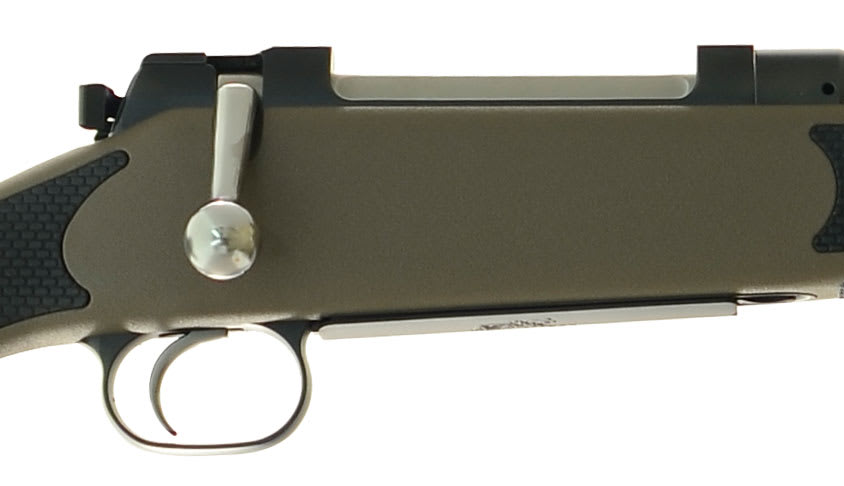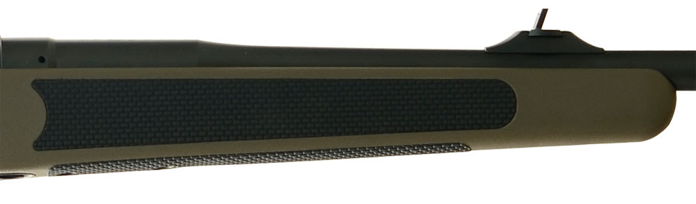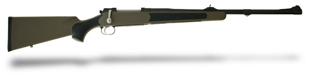 This khaki colored Mauser M03 Africa Extreme rifle features a synthetic, high density, shatter proof stock with black, non-slip elastomer inlays, high-quality steel action and barrel, and a sling swivel at the tip of the fore-end.