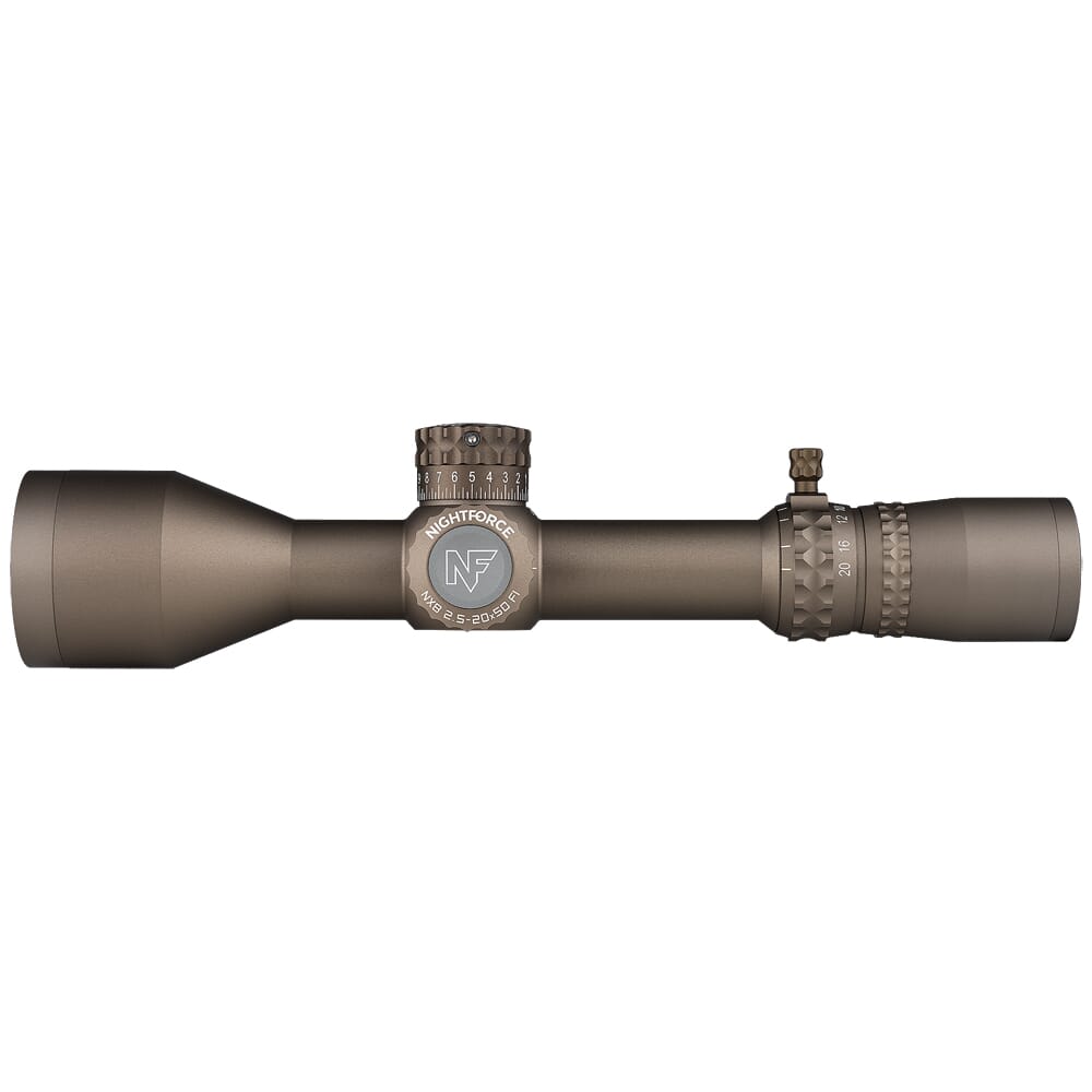 The Nightforce NX8 2.5-20x50 F1 .25 MOA Illum PTL MOAR Dark Earth Riflescope C685, featuring an illuminated MOAR reticle at the center and a convenient Power Throw Lever (PTL), is an ultra-compact and durable optic. It inherits the robustness of Nightforce's NXS family while introducing the first focal plane performance with an 8x zoom range. This broad zoom capability facilitates rapid close-range and long-range target detection and engagement. Notable features include the ZeroStop elevation adjustment for swift zero return, a 50mm objective optimized for resolution and light transmission, and a parallax adjustment down to 11 yards. With a compact size and Dark Earth finish, the Nightforce C685 riflescope is an excellent choice for semi-auto precision or compact bolt-action rifles.
