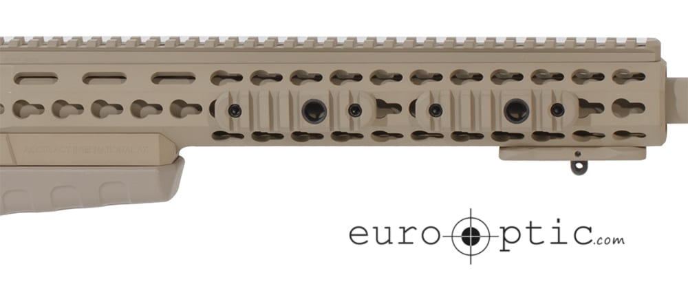 • While the top foreend rail is full-length (and matched to the angle of the action rail), the foreend of the AXMC is an octagonal tube featuring AI's patented KeySlot mounting system. This foreend is easily removed with the 4mm hex wrench stored in the cheekpiece.