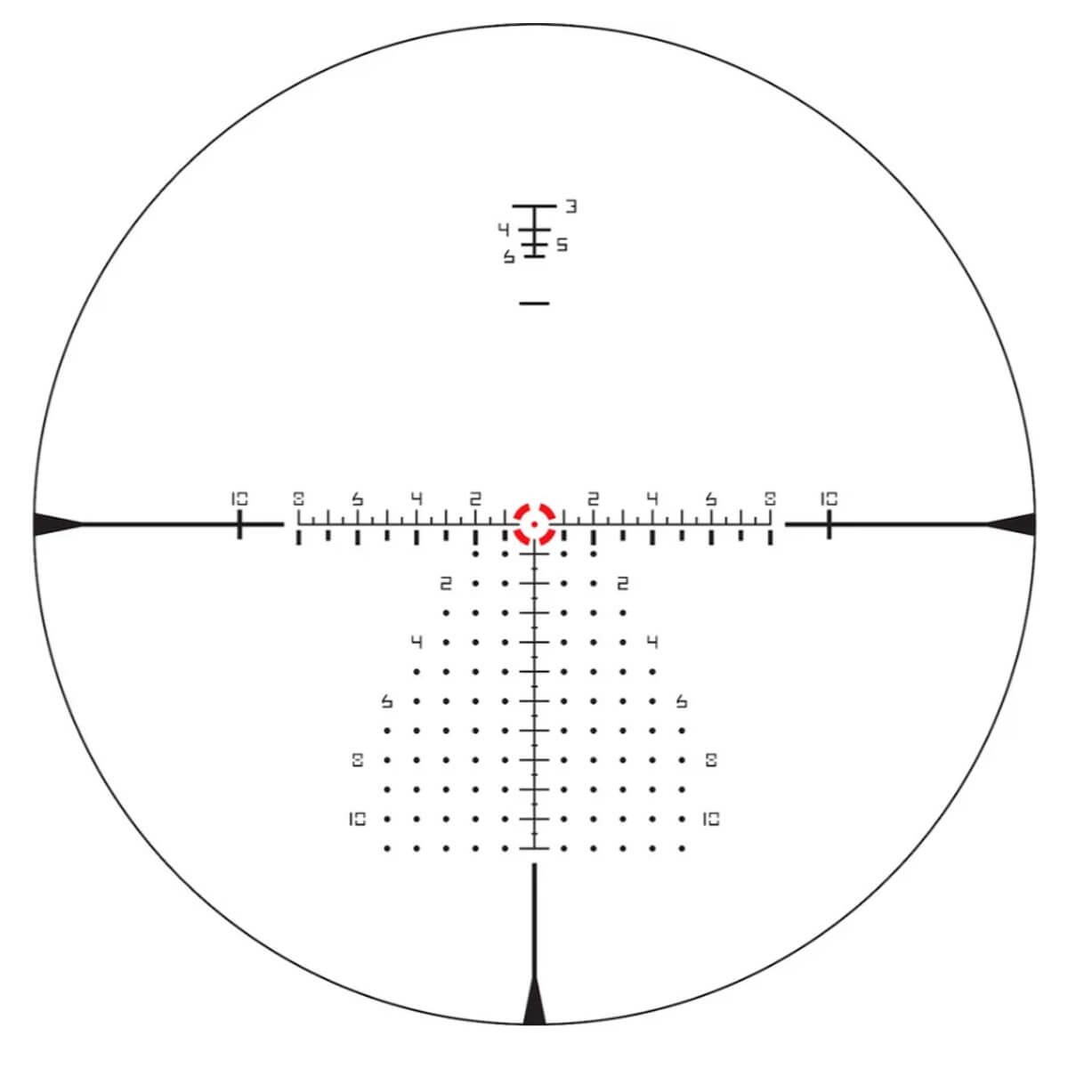 The Vortex EBR-9 MRAD (Enhanced Battle Reticle) is a precision riflescope reticle featuring hashmarked ranging elements. Utilizing MRAD (Milliradian) based subtension lines, the reticle is designed to assist shooters in making accurate adjustments for ranging, holdover, and windage corrections. This system provides a comprehensive and efficient tool for users who require precise measurements and calculations while aiming and shooting with their riflescope. The MRAD-based design enhances the reticle's versatility and effectiveness for tactical and long-range shooting applications.