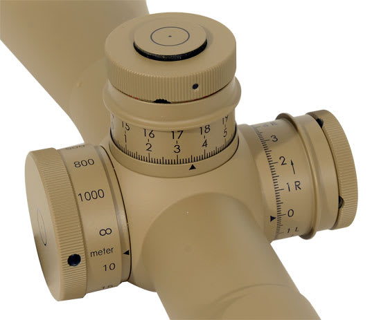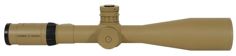 The Schmidt Bender PMII LT 5-25x56 riflescope features two-turns for elevation adjustment, the second of which is tactile markings, the elevation and windage turrets each feature "MTC" function, and a locking function on the two adjusting turrets.
