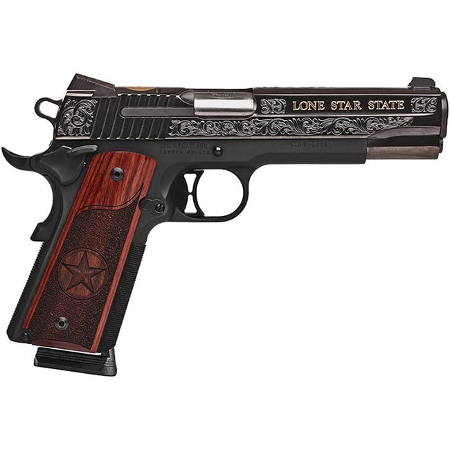 The 1911 pistols from Sig Sauer feature all stainless steel frames and slides machined to exacting tolerances and hand-fitted to insure reliability and performance. The 1911 Texas Gold contains only premium internal parts including a match grade barrel, hammer/sear set and trigger. The slide features adjustable night sights while the frame features 25-line per inch checkering on the front strap and 20-line per inch on the mainspring housing and is complimented by a set of checkered custom wood grips. For safety the Sig Sauer 1911 features a beavertail grip safety, extended thumb safety and firing pin safety. Custom engraved on the slide is the quote from General Robert E. Lee, "The Enemy Never Sees the Backs of My Texans" as well as the Texas seal.