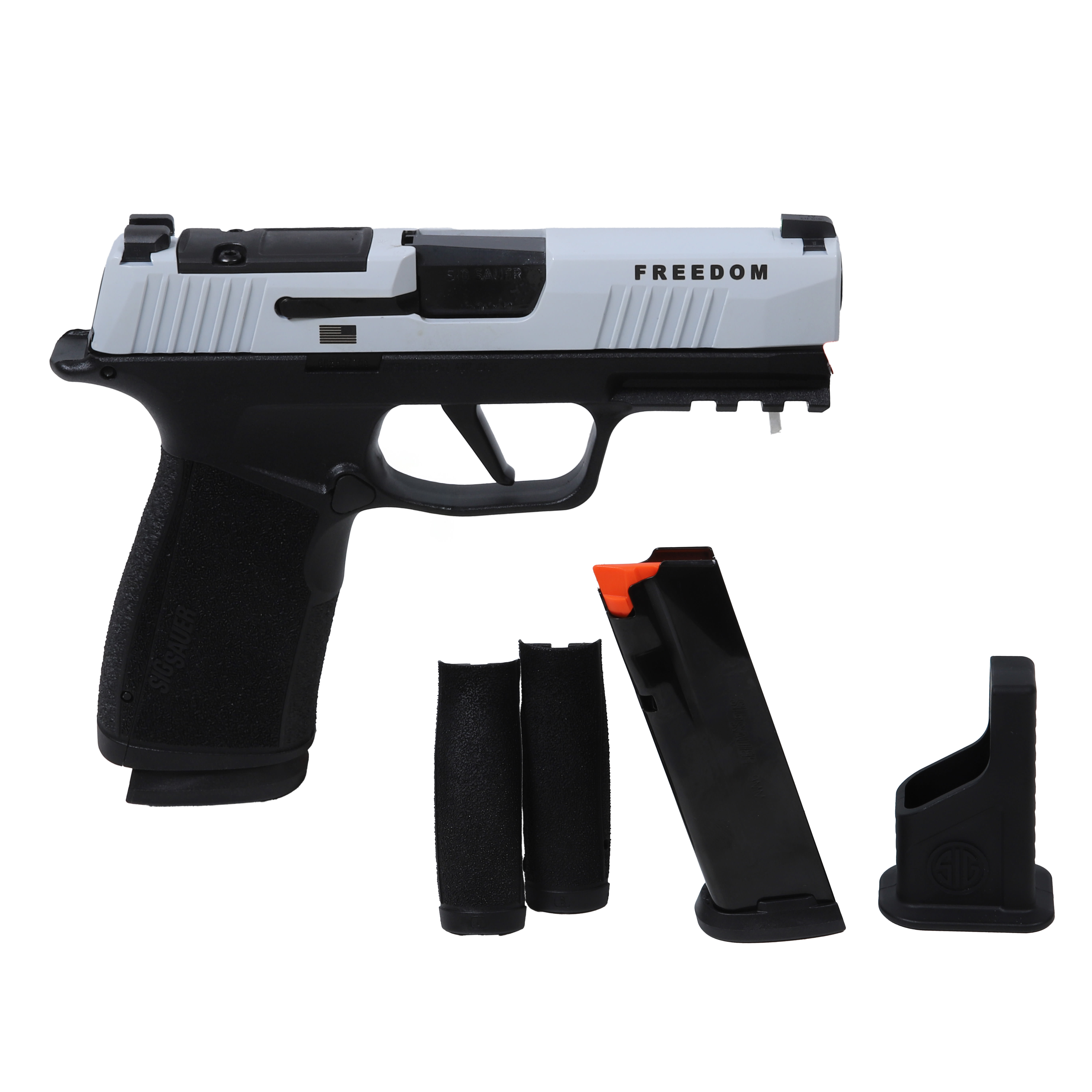 The Sig Sauer Limited Edition Freedom Series P365 TPUSA is a compact, high-capacity 9mm designed for modern carry and range performance - featuring a 3.7" barrel in Sig’s X-Series platform, striker-fired reliability, and an optics-ready slide fitted with X-Ray3 sights for fast, precise target acquisition. Finished in a distinctive two-tone treatment and fitted with textured polymer grips for secure control, this model ships with two 17-round steel magazines to maximize firepower in a concealable package. Built for everyday carry, quick handling, and dependable shooting, the Freedom Series P365 blends contemporary ergonomics and sighting options with collectible, limited-edition styling.