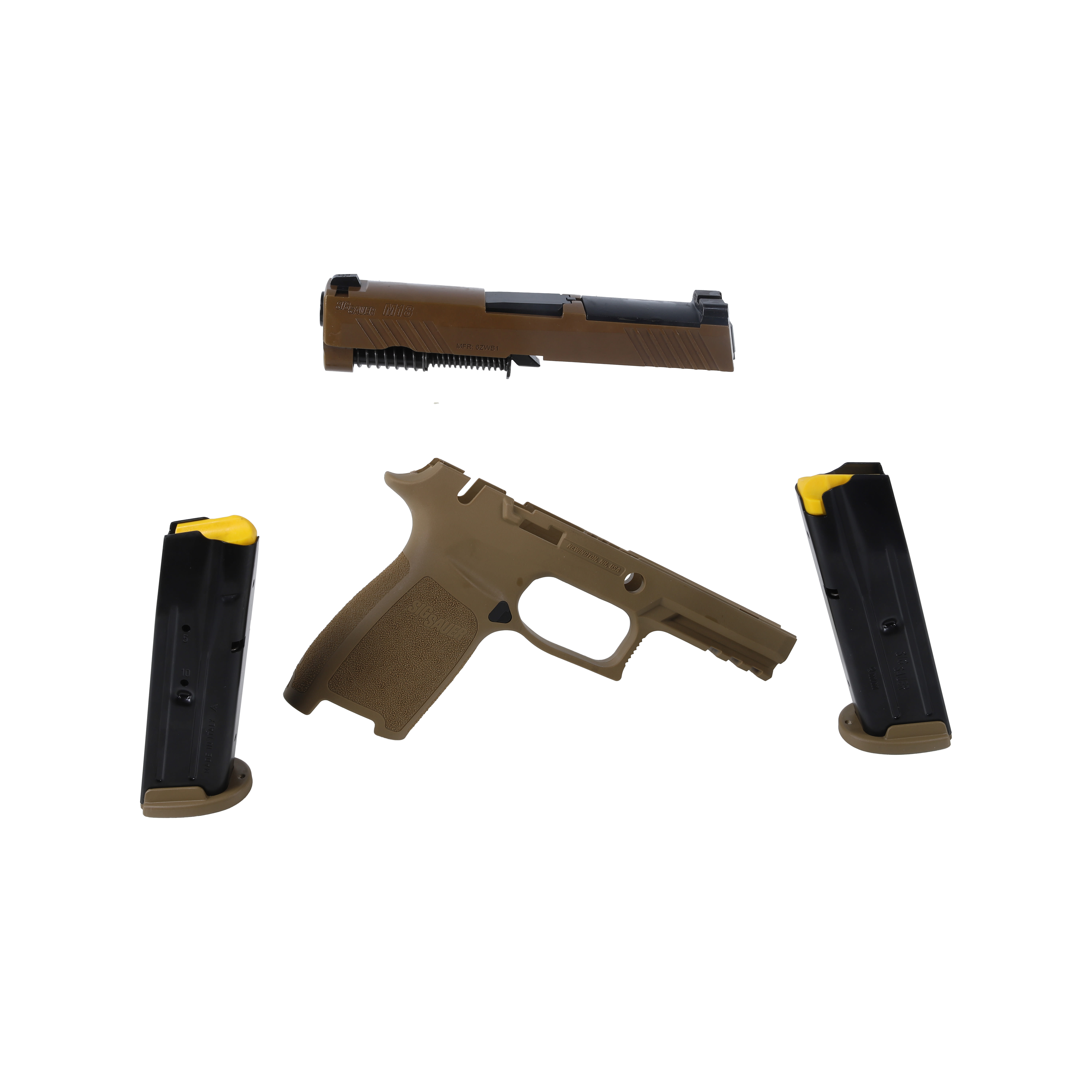 The SIG Sauer Caliber X‑Change Kit — P320 → M18 Carry (CALX‑M18‑CSS‑MS‑10) is a factory OEM conversion kit that turns a compatible P320 fire‑control unit into the commercial M18 carry configuration. Finished in coyote PVD, the kit ships as a drop‑in package with a 3.9″ optics‑ready M18 slide (SIG‑LOC/MHS footprint), 3.9″ barrel and recoil assembly, a carry‑length coyote grip module with manual safety, and three 10‑round magazines for 10+1 capacity. The slide accepts ROMEO‑M17/MHS‑pattern optics and includes SIGLITE sighting provisions with a removable rear night‑sight plate — delivering military‑style ergonomics and optics capability without the need for gunsmithing. Confirm your P320 FCU (manual‑safety vs non‑safety, caliber) before installing the kit.
