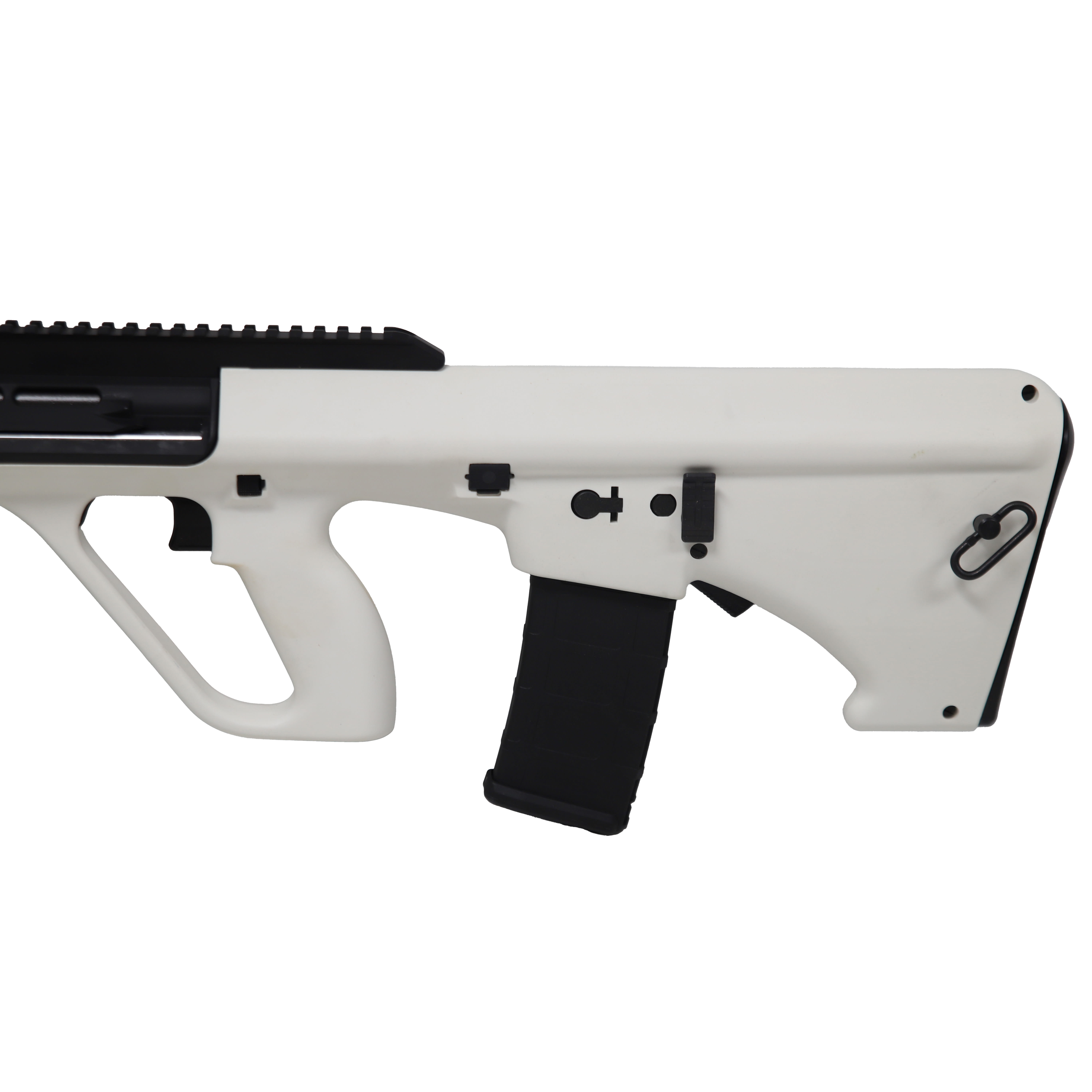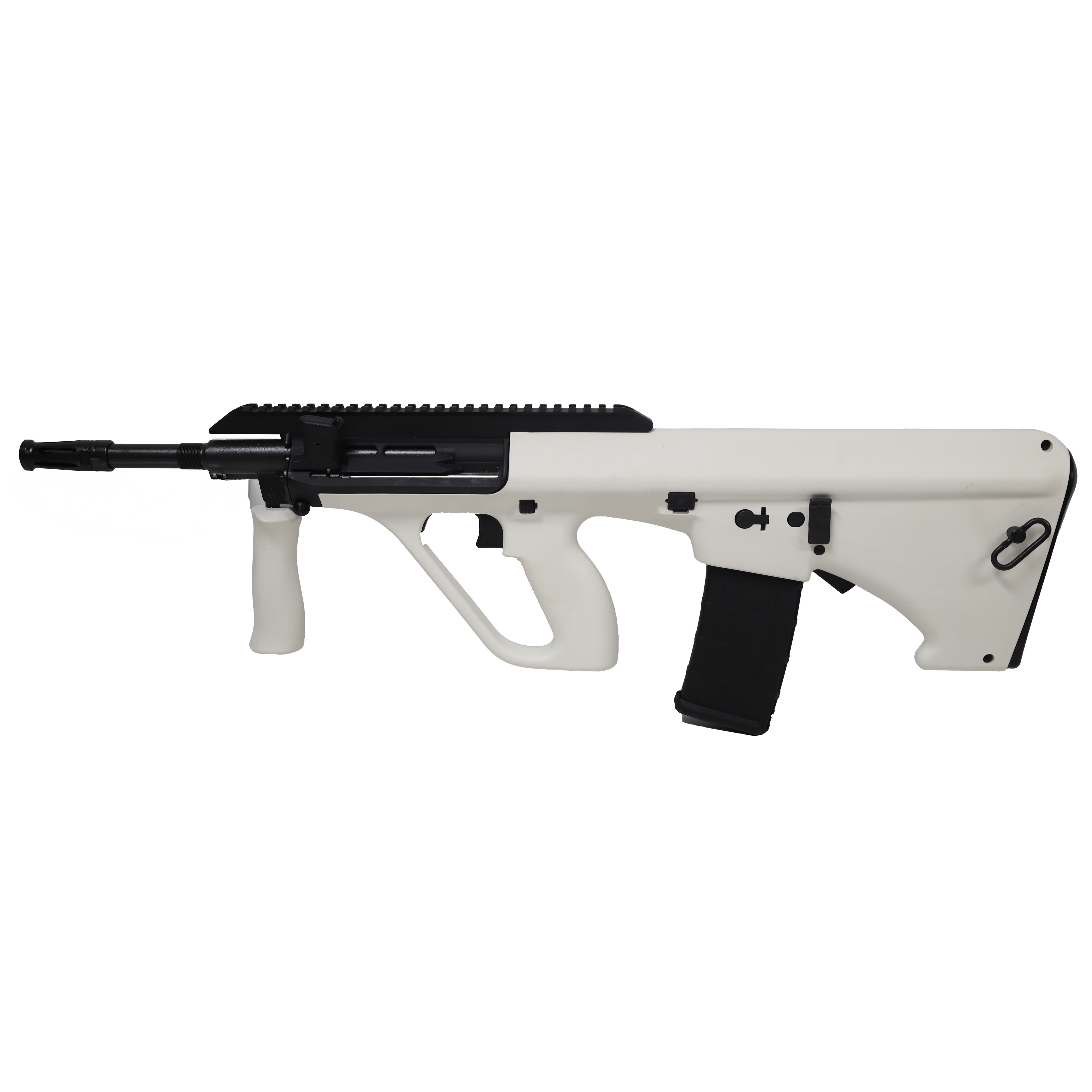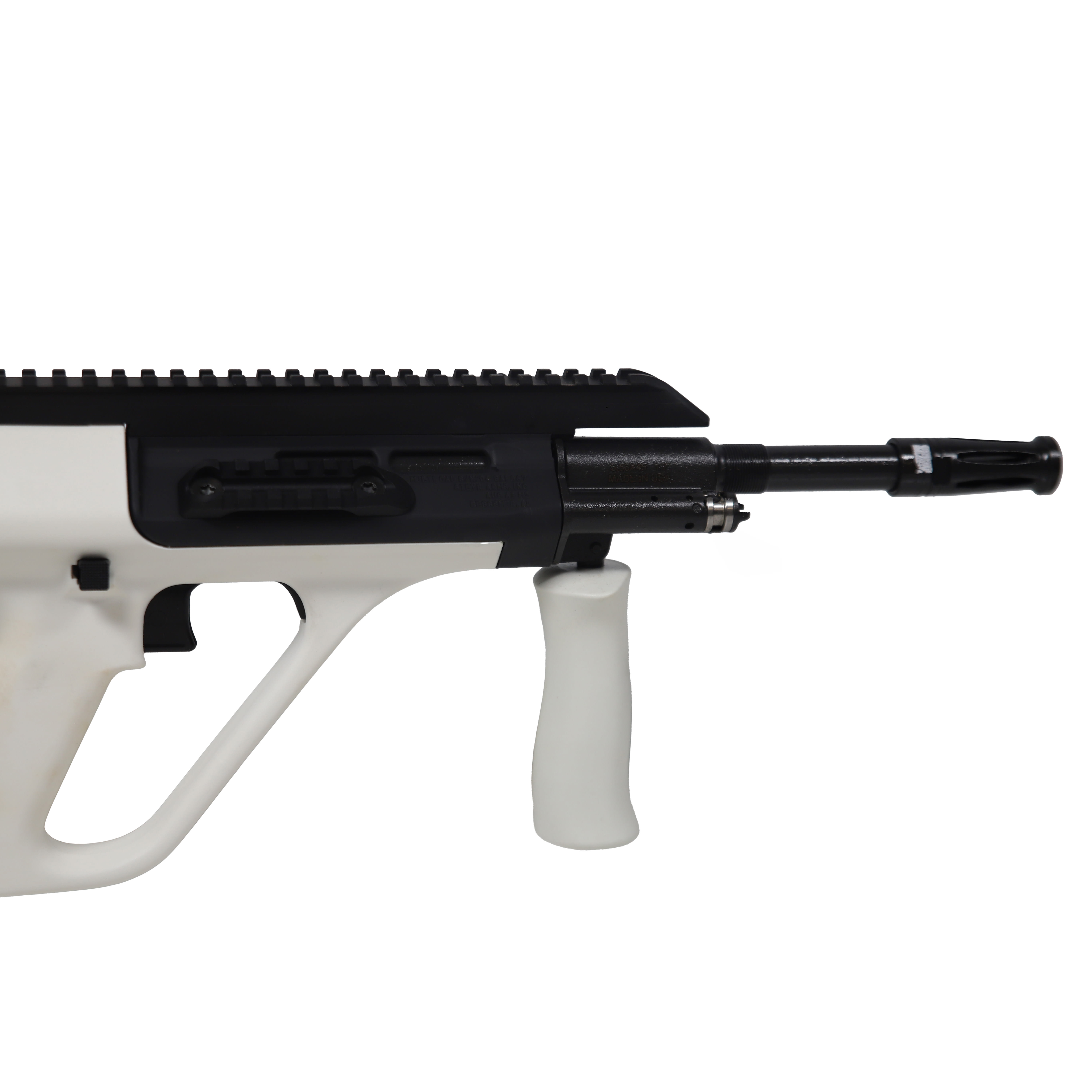 The Steyr AUG A3 M2 NATO is a combat-proven Austrian bullpup rifle chambered in 5.56x45 NATO, delivering the same iconic performance and futuristic design that has made the AUG a staple of military and law enforcement agencies around the globe for decades. This white variant features a 16-inch cold hammer-forged barrel within the AUG's compact bullpup layout, offering outstanding ballistic performance and maneuverability in a package considerably shorter than traditional rifle configurations. The A3 M2 NATO model is equipped with an extended Picatinny top rail for seamless optics and accessory mounting, and accepts standard NATO STANAG magazines, greatly expanding magazine compatibility compared to the standard AUG platform. Built with a rugged polymer receiver and Steyr's hallmark precision engineering, the rifle delivers exceptional accuracy, durability, and reliability in a wide range of environments and conditions. The distinctive white finish makes this an attention-grabbing option for collectors and sport shooters alike, and the rifle ships ready to run with one 30-round NATO magazine included.