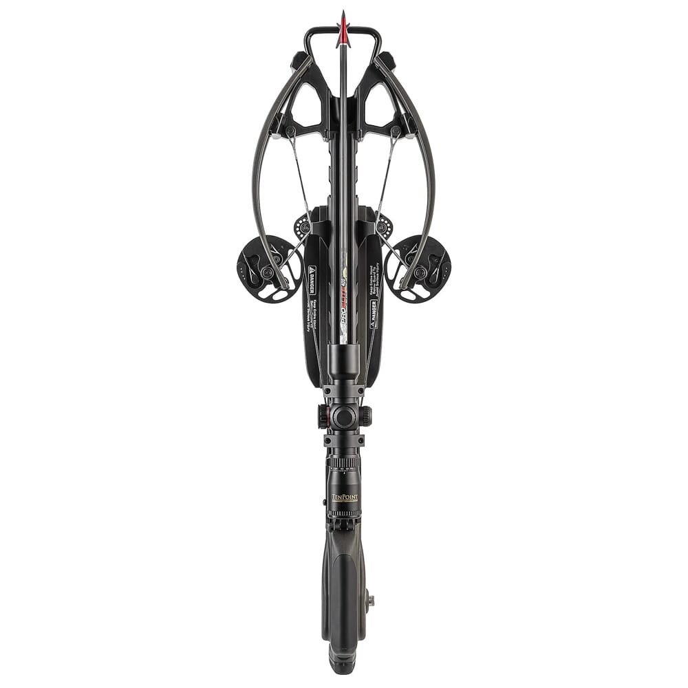 The crossbow also comes with TenPoint’s RangeMaster Pro Scope, which requires no adjustment for distance and features three duplex crosshairs calibrated for 20, 30, 40, and 50 yards, plus a triangle for targets at 60 yards.