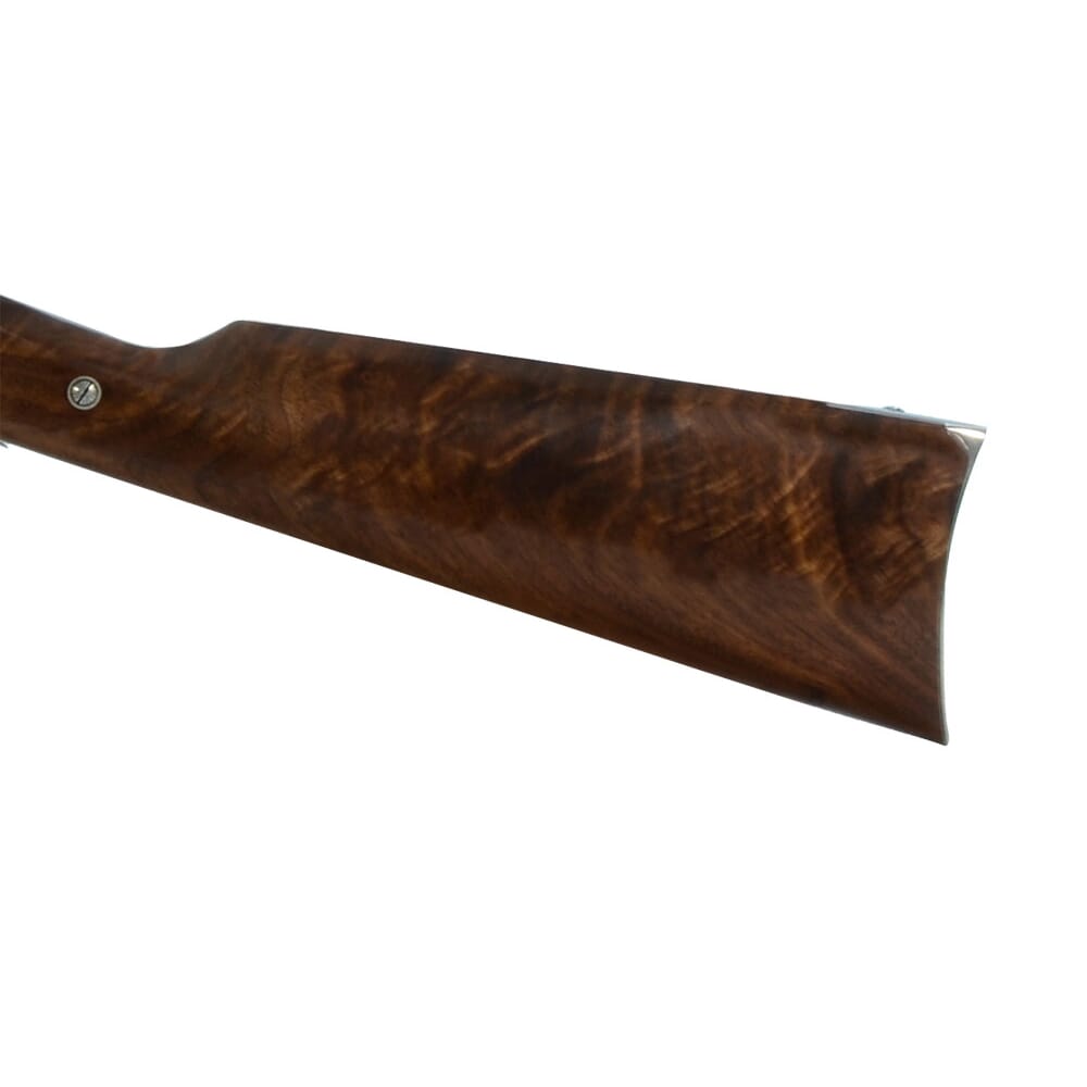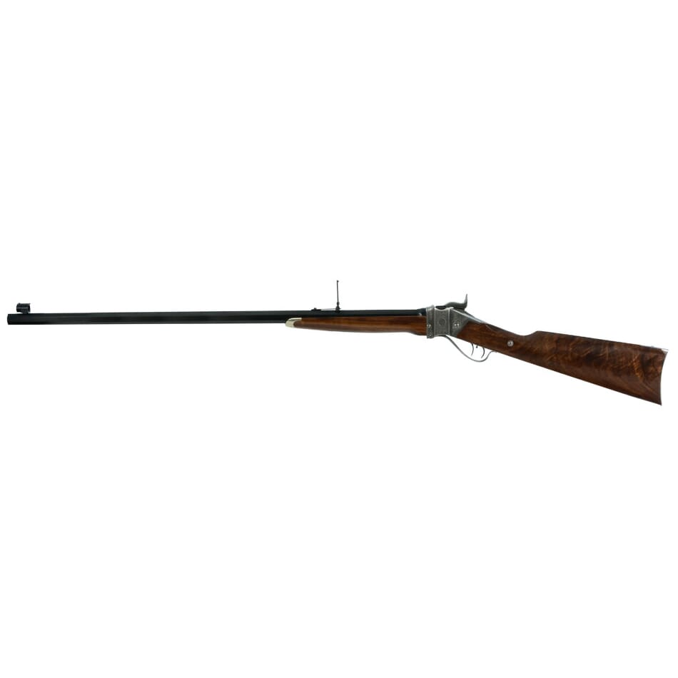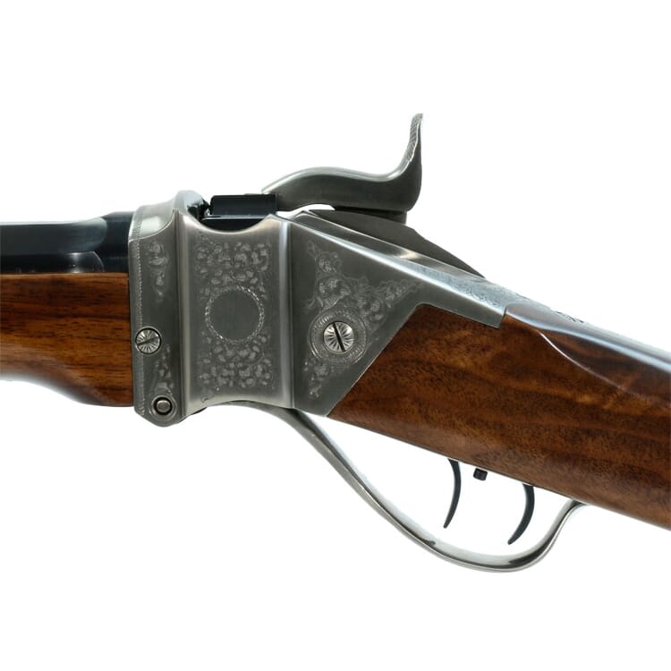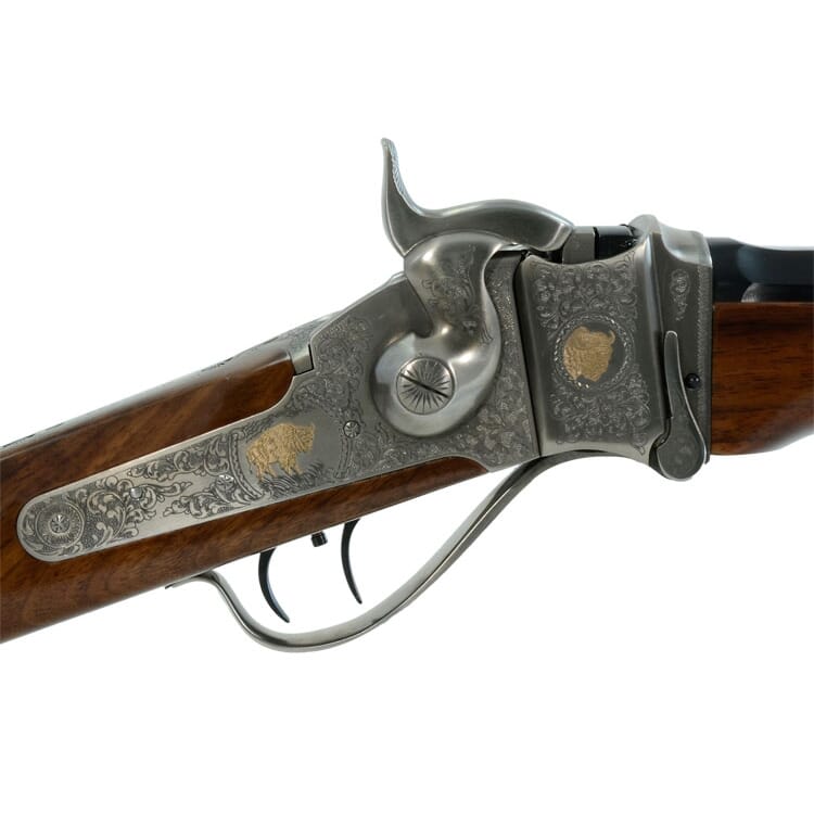Previously the Uberti Sharps "Extra Deluxe" .45-70 Rifle was only available through select World Class Collection dealers. The Extra Deluxe features a straight AAA-grade walnut stock, detailed engraving with gold-inlaid bison and bison head, dovetailed front globe sight, case-hardened levers, buttplate, blue steel finish, blue octagonal barrel, double set trigger, and pewter forend cap.