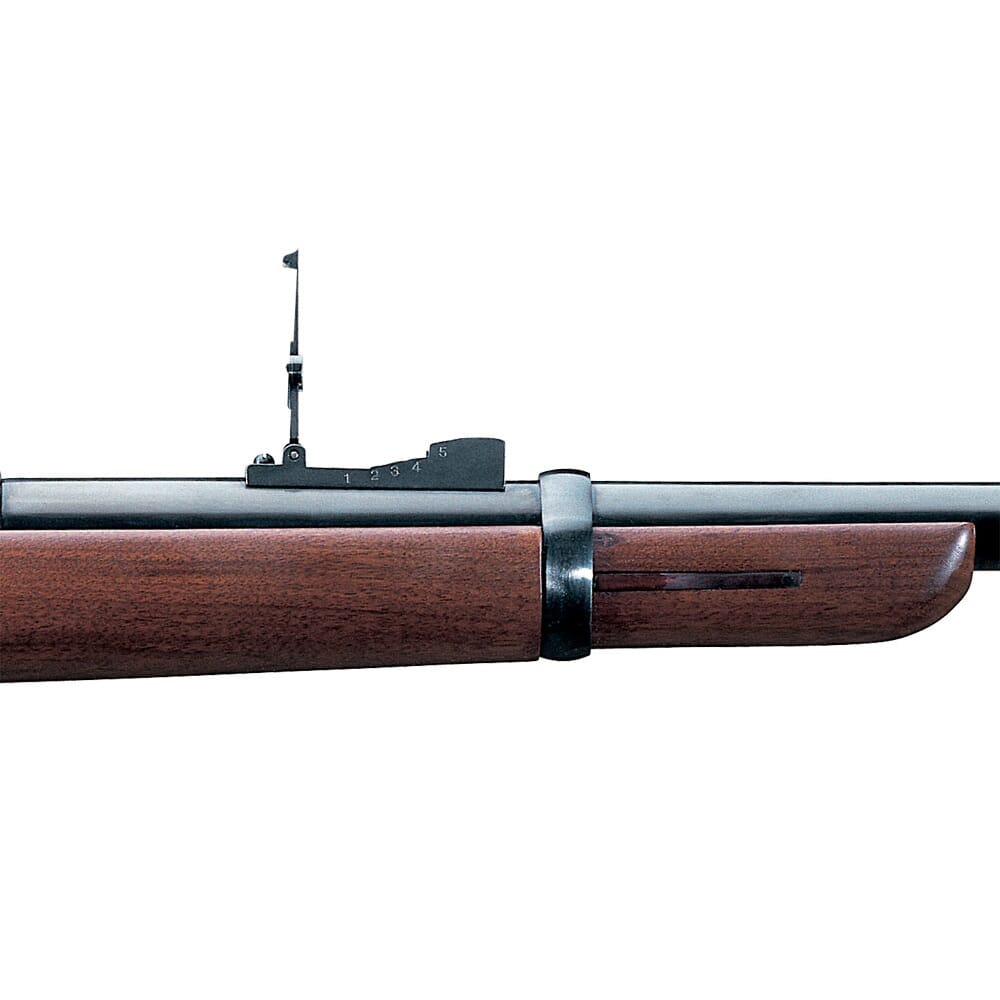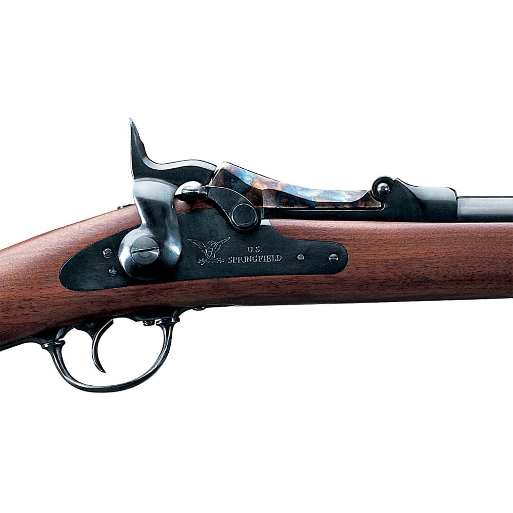The Springfield Trapdoor Cartridge Rifle and Carbine was produced for the military in 1873. It was a redesign of the Army’s Allin Trapdoor rifle. The Springfield Trapdoor held the new, more powerful .45-70 military cartridge. Full-stocked, 32 inch barreled rifles, as well as half-stocked, short-barreled carbines, were produced.
