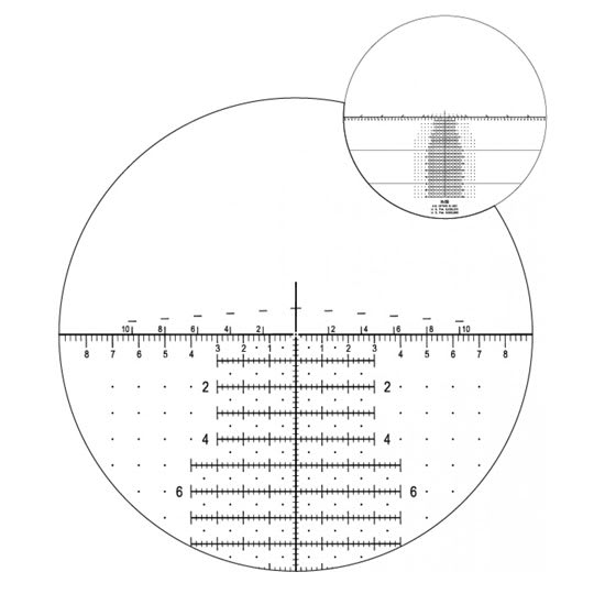 This US Optics ER25 5-25x58 riflescope with Horus H-59 reticle features a turret parallax left side focus, low profile rapid focus eyepiece, matte black type III hard anodizing, 12 position digital illumination, US#3 .1 mil windage knob, and a EREK .1 mil elevation knob with 110 clicks per revolution.