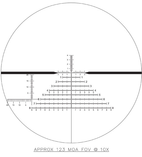This US Optics MR-10 1.8-10x37 riflescope with HORUS H-425 reticle features a turret parallax left side focus, low profile rapid focus eyepiece, matte black type III hard anodizing, 12 position digital illumination, US#1 .1 mil windage knob, and EREK .1 mil elevation knob with 90 clicks per revolution.
